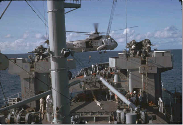 Helo lift of seven Hassayampa crewmen to USNS Corpus Christi Bay near Muroia Atoll - September 1973