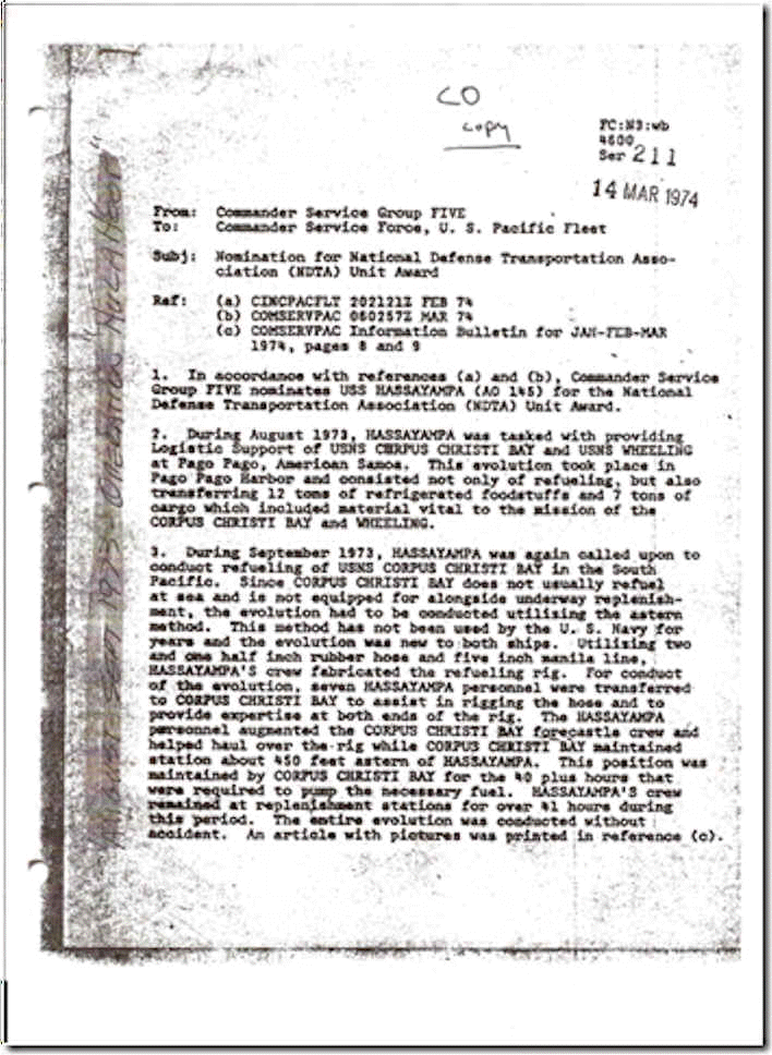standards of performance expected of a fleet oiler. She is highly recommended for the subject award."