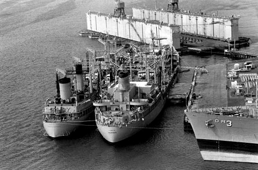 USNS Passumpsic (T-AO 107) berthed port side of USNS Hassayampa (T-AO145) Subic Bay, Philippines June 1982